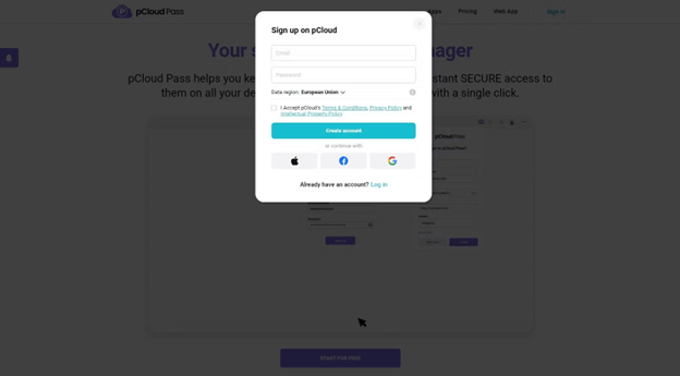 Go tothe website for pCloud Pass and click on the button that says Start for Free. After entering your email address and coming up with a safe password, click the Create Account button. You also have the option to sign up for an account by using an existing Google, Facebook, or iCloud profile.